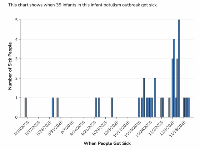 As of December 3, 2025, a total of 39 infants with suspected or confirmed infant botulism and confirmed exposure to ByHeart Whole Nutrition infant formula (various lots) have been reported from 18 states. Laboratory confirmation for some cases is ongoing. Illnesses started on dates ranging from August 9 to November 19, 2025. All 39 infants were hospitalized. No deaths have been reported to date. For 38 infants with age and 39 with sex information available, they range in age from 16 to 264 days and 15 (38%) are female.