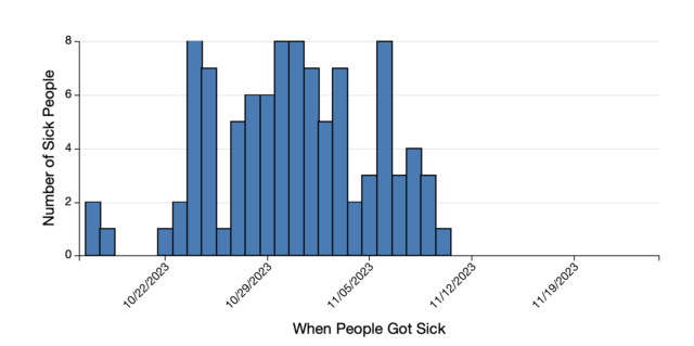 As of November 24, 99 people infected with the outbreak strain of Salmonella have been reported from 32 states. Arkansas (1), Arizona (7), California (1), Colorado (2), Georgia (3), Iowa (5), Illinois (4), Indiana (2), Kentucky (5), Massachusetts (1), Maryland (1), Michigan (1), Minnesota (13), Missouri (9), Mississippi (1), North Carolina (2), Nebraska (4), New Jersey (1), Nevada (2), New York (1), Ohio (8), Oklahoma (1), Oregon (1), Pennsylvania (1), Rhode Island (1), South Carolina (3), Tennessee (4), Texas (3), Utah (1), Virginia (1), Washington (1) and Wisconsin (8). Illnesses started on dates ranging from October 17, 2023, to November 10, 2023. Of 77 people with information available, 45 have been hospitalized. Two deaths have been reported from Minnesota.  Age of ill ranges from less than 1 to 100 years of age.  60% are male and 40% are female.