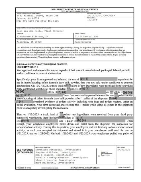 483 2025 – “Observation 1: You approved and released for use an ingredient that was not manufactured, packages, labeled, or held under conditions to prevent adulteration.” “Observation 2: You did not exclude pests from your food plant to protect against contamination of food.” “Observation 3: You did not maintain a building used in the manufacture, processing, packing or holding infant formula in a clean and sanitary condition.”