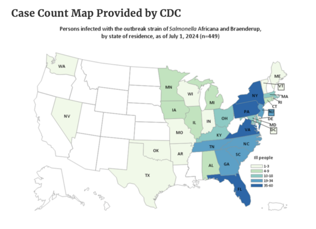 As of July 2, a total of 449 people infected with one of the outbreak strains of Salmonella Africana and SalmonellaBraenderup have been reported from 31 states and the District of Columbia (see map). Of these illnesses, 215 people were infected with the newly added Salmonella Braenderup strain. Illnesses started on dates ranging from March 11, 2024, to June 4, 2024 (see timeline). Of 360 people with information available, 125 have been hospitalized and no deaths have been reported.